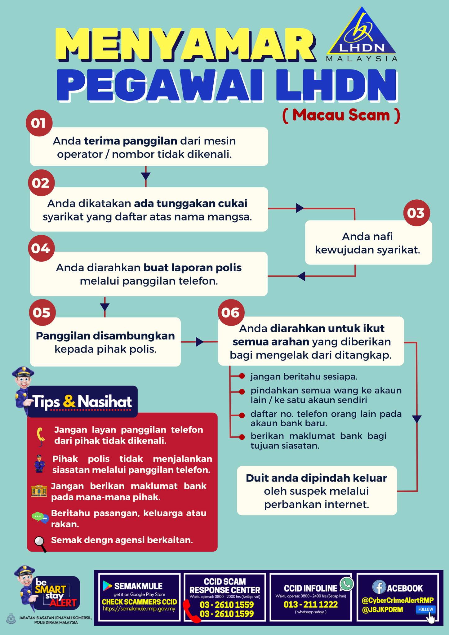 任何疑问,可致电 03-26101559/1599 联系全国商业罪案调查部的诈骗回应中心(CCID Scam Response Centre)以查询详情。