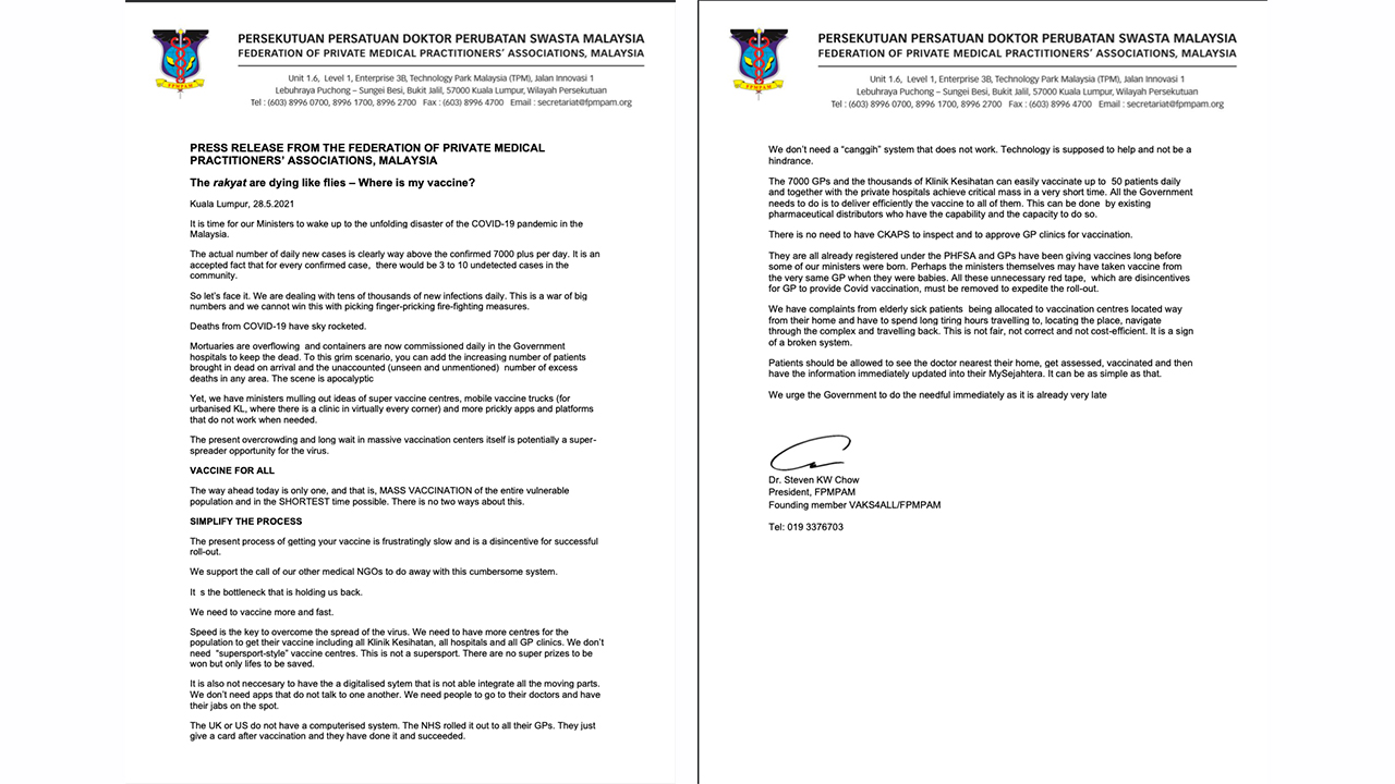 疫情记录天天刷新,医疗体系日益紧张,大马私人医生协会联合会(FPMPAM)促请尽速撤除不必要的繁文缛节,让各地私人诊所及家庭医生加入“接种行列”,全面加速全国的疫苗中心工作。