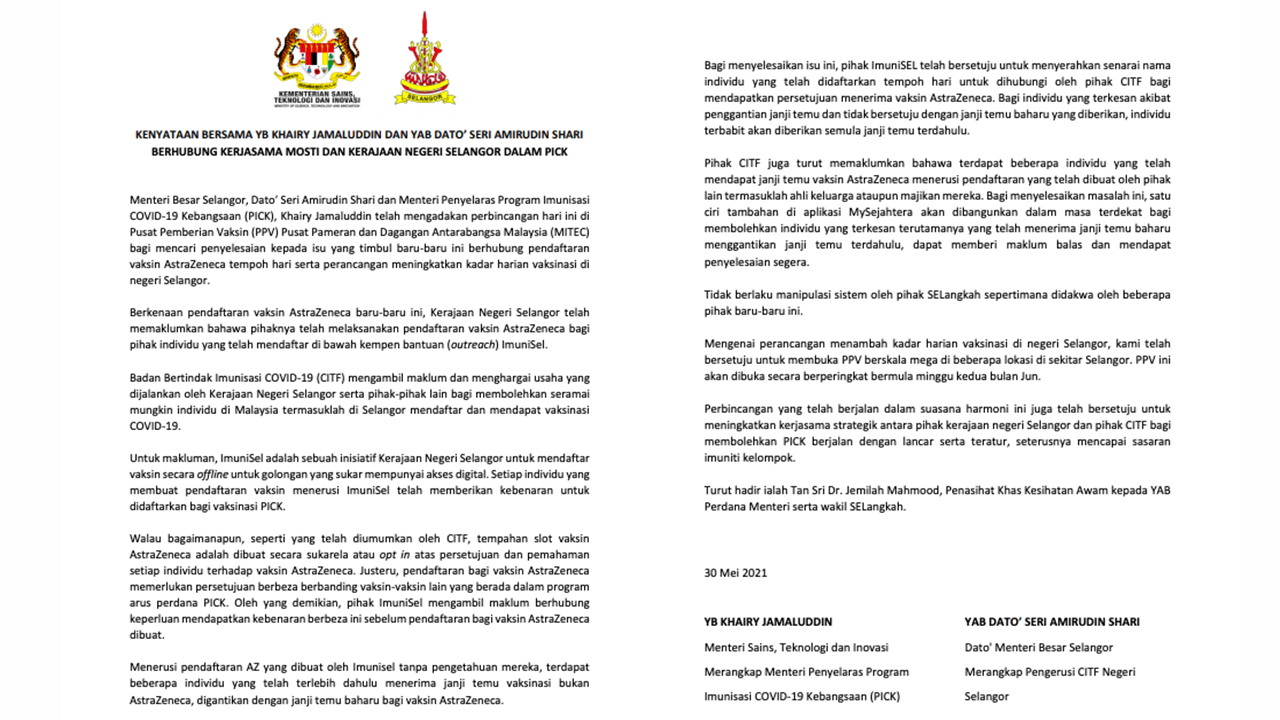 新冠肺炎免疫特工队(CITF)“指控” 雪州政府SELangkah代抢AZ疫苗并遭SELangkah否认争议,经科艺部长与雪州大臣阿米会面协调后“误会化解”,雪州新冠肺炎免疫计划(ImuniSel)将向CITF呈交名单,以联系“被登记者”来确认他们是否愿意接种AZ。