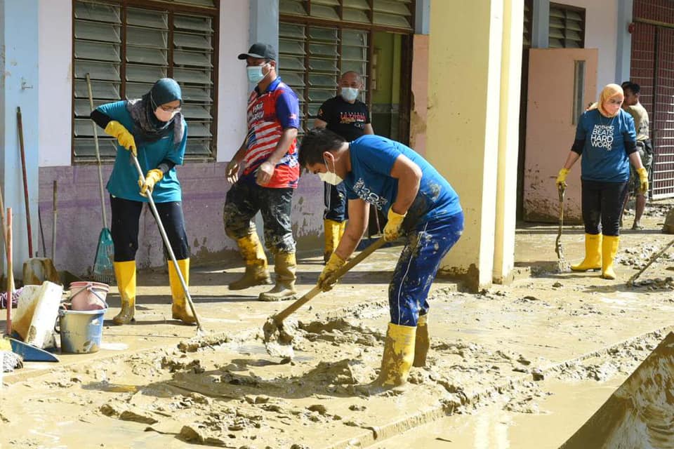 他说,他到彭亨州文冬国中协助清理水灾垃圾时,被告知这是该校第一次受灾,水位几乎达二楼。底层所有桌椅及器材都严重损毁,包括教师室及电脑室家具和器材。