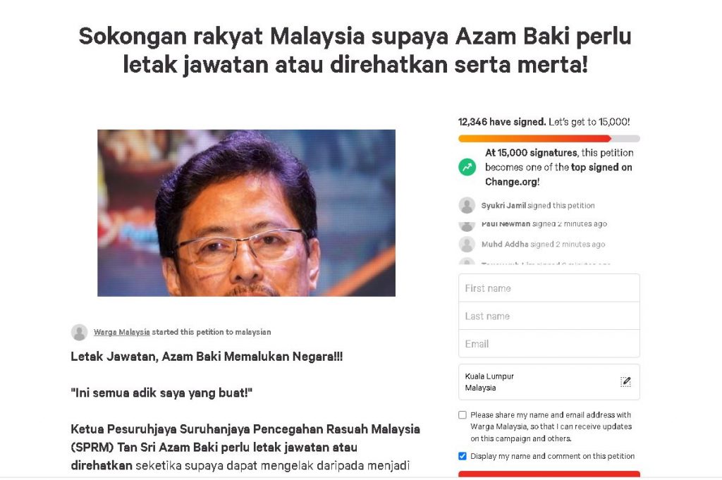 另一方面,超额持股争议白热化,网络上讨伐及促请阿占巴基下台的声浪日益壮大,包括网络发动联署请愿,促请阿占巴基立即辞职或放假,联署目前获得超过1万2000人签署支持。