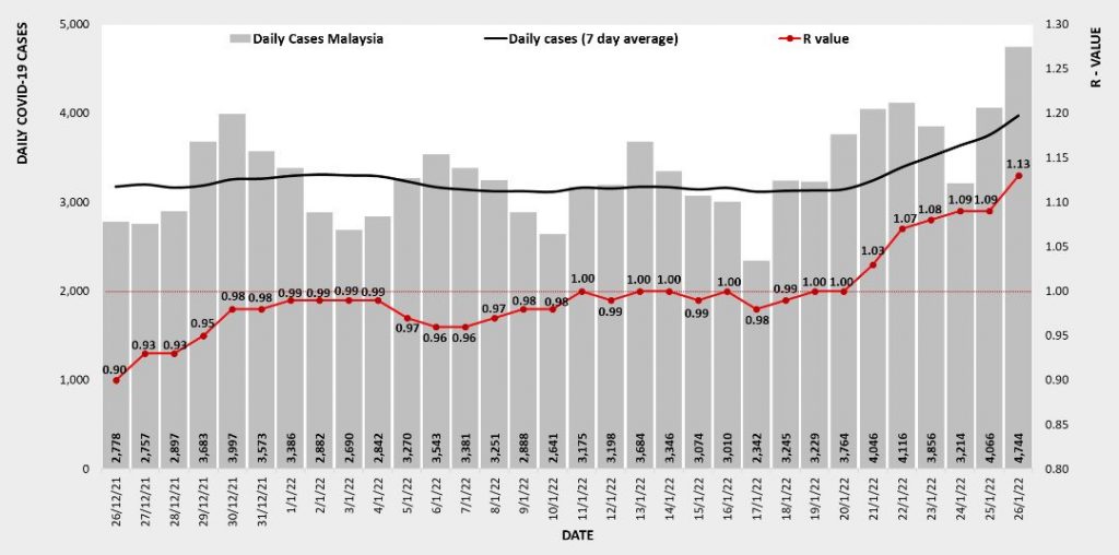 另一方面,随着确诊病例持续上升,我国在昨日新增4744例,是过去一个月的最高记录,而全国基本传染数(Ro/Rt)也飙升至1.13。
