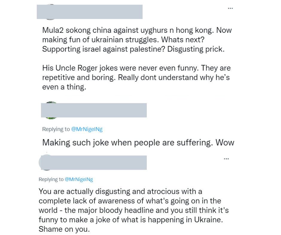 乌俄爆发战争,在全世界关注这个大事发展时,大马网红“Uncle Roger”黄瑾瑜一个相关推文遭网民指称不应把玩笑开到严肃的战事上,怒斥他言行不当!