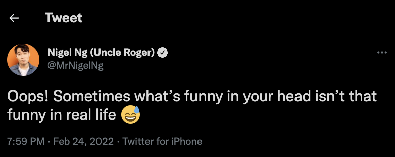 “Uncle Roger”黄瑾瑜(Nigel Ng)因视频内容搞怪出彩而红遍国际,在乌俄爆发战事后,他在自己的推特上发了一个帖子:写着:“要把乌克兰加入我的HAIYAA世界巡演中!敬请期待……”