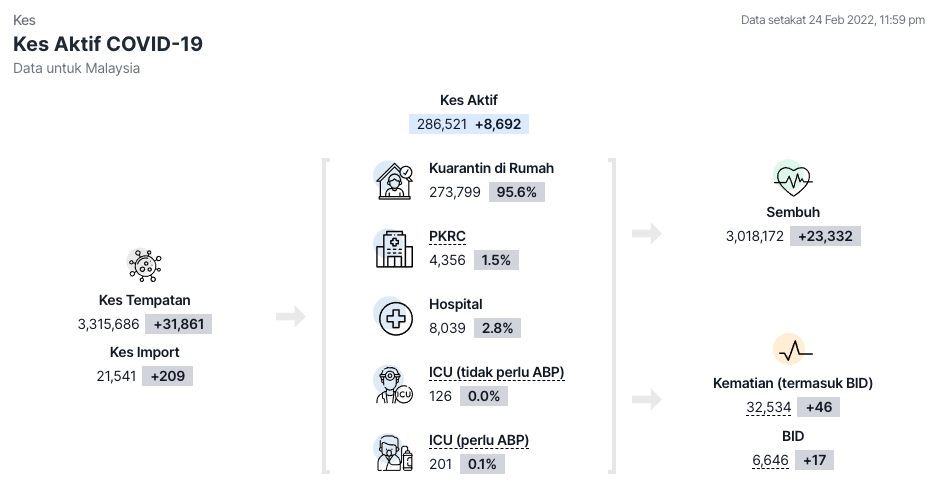 卫生部COVIDNOW网站通报,截至24日11.59pm,我国新增 #32,070宗,累计病例至今 #3,337,227宗,再有46死。