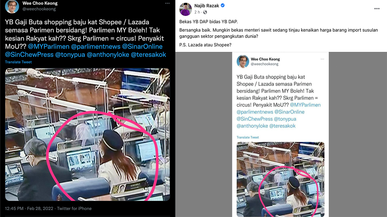 黄朱强今午在自己的推特上,特别标签人在国会的郭素沁,他在照片中用红色圈起了郭素沁座前电脑的画面,然后斥她人在开国会,心却在网购,浏览Shopee/Lazada看衣服,白领议员的薪水。