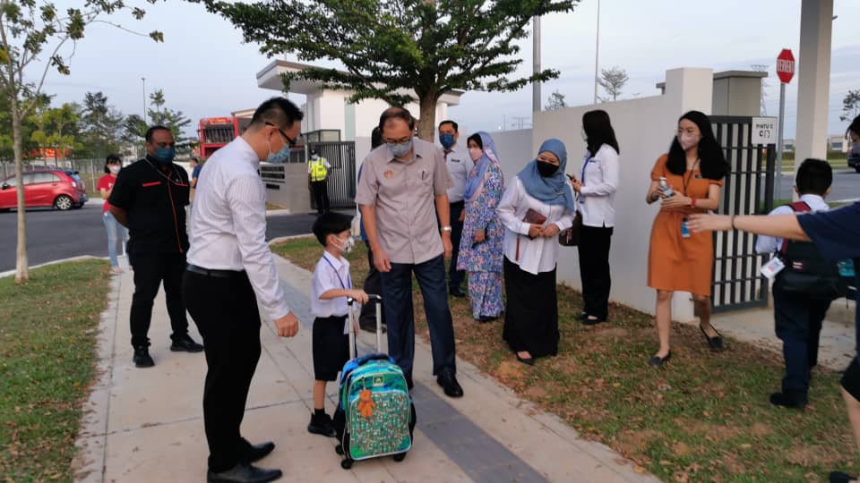 教育部副部长马汉顺今早也特地前来巡视及了解学校和学生上课情况,尤其学生书包重量问题。