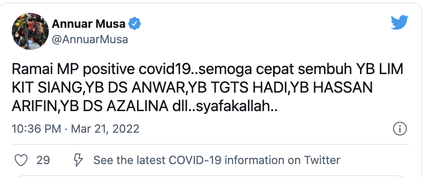 他发推说,很多国会议员都确诊,即安华、林吉祥、哈山阿里芬,还有阿莎丽娜及伊党主席兼马江区国会议员哈迪阿旺,祝福他们早日康复。