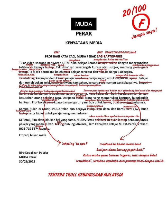 女教授斥责B40学生没买电脑风波获得国内各界广泛关注,包括MUDA霹雳联委会,而该党所发出的文告,却被指“语法不通错漏百出”,更有网民充当老师直接把文告改成“满江红”,意外成了另一延伸焦点!