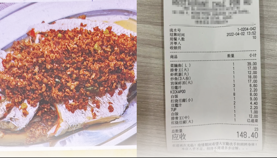 根据《东方日报》及《星洲日报》的报道,按照店主所上载账单显示,该桌食客有9人,他们点的菜包括菜脯鱼、排骨王、虾煎蛋、炒鱼、宫保虾羔、红烧豆腐、9碗白饭、豆蔻汁等,账单是148令吉。