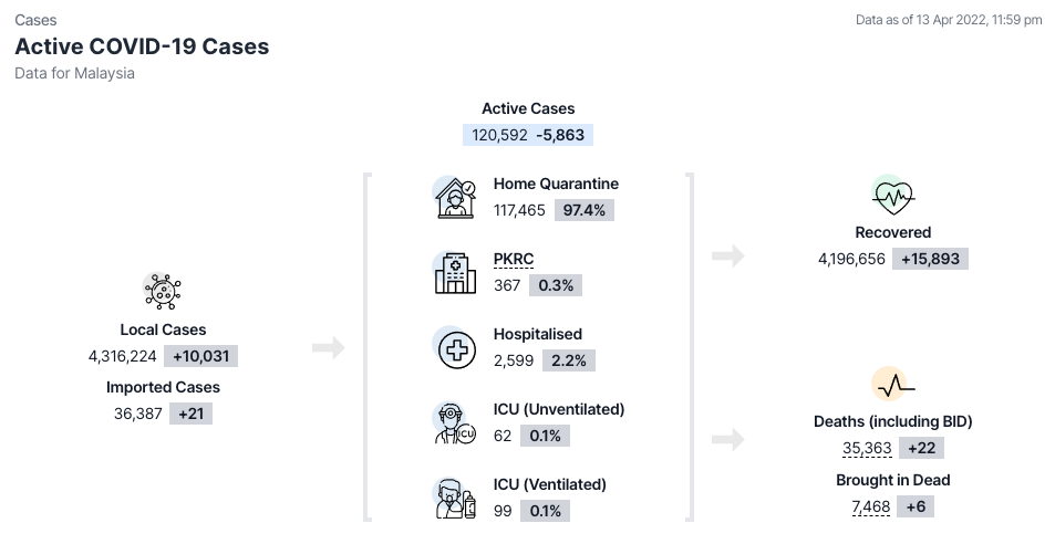 卫生部COVIDNOW网站通报,截至13日11.59pm,我国新增 #10052宗,累计病例至今 #4,352,611宗,再有22人死。