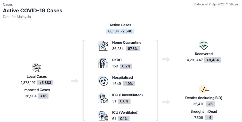 卫生部COVIDNOW网站通报,截至20日11.59pm,我国新增 #5889宗,累计病例至今 #4,415,101宗,再有5人死。