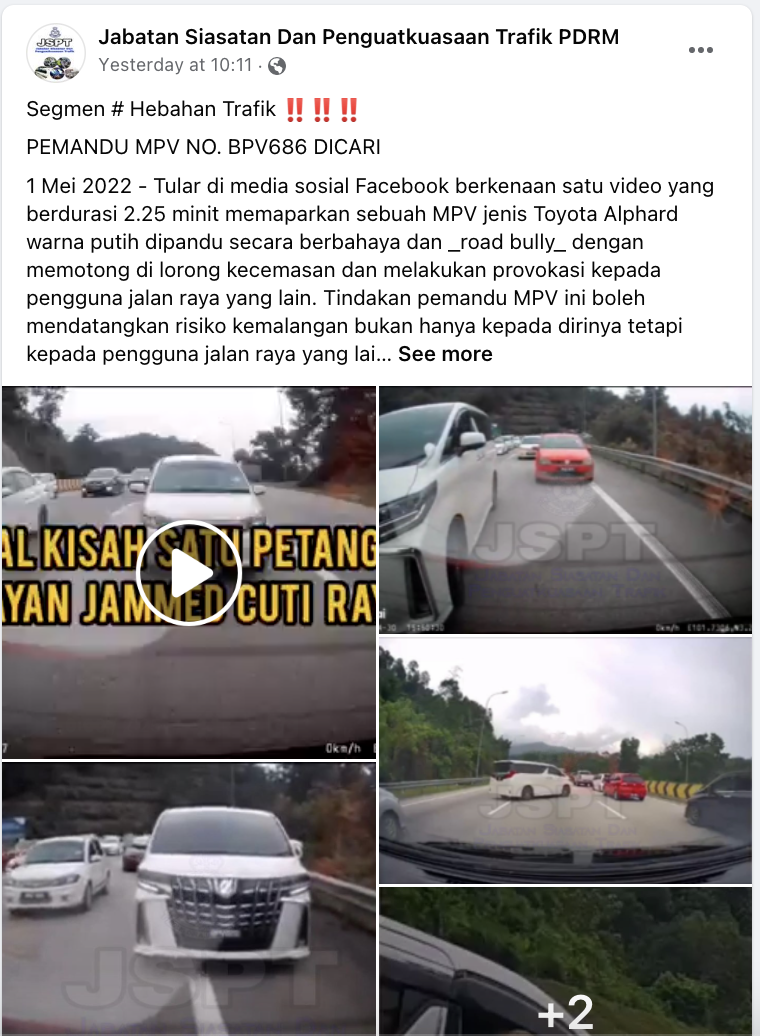 这桩路霸挑衅案是发生在4月30日,在吉隆坡加叻大道往东海岸第25.1至27.5公里的路段发生。根据流传长2分钟25秒行车记录仪视频显示,这辆车牌号码为BPV 686的白色丰田Alphard休旅车,在塞车路段滥用紧急车道超车,甚至摇下车窗向其他轿车司机做出挑衅动作。
