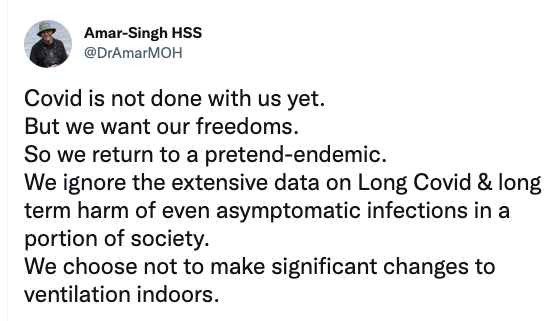 阿马星医生在推特推文说,正当大家装作处于地方流行病阶段时,却都忽略新冠肺炎长期症状(Long Covid),及无症状感染者长期危害的数据。