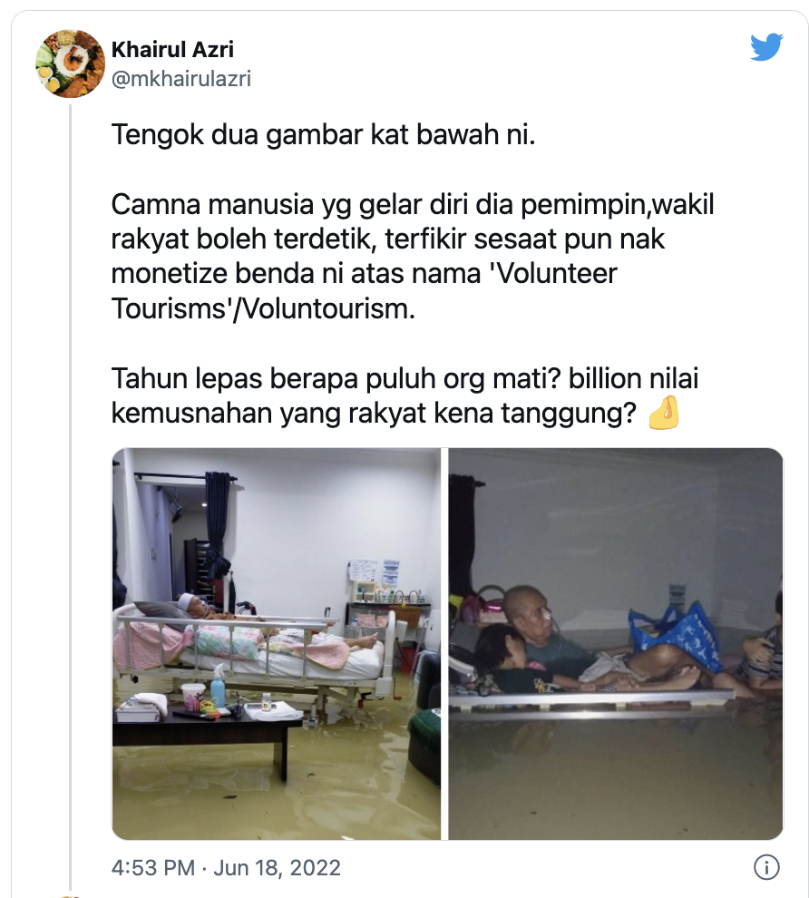 名为mkhairulazri的网民则分享了两张病人被困在水灾中的照片,并写道:“自称为领袖、人民代表的人,怎么会有那么一秒想到要以志工旅游的名义,用这件事来赚钱?去年死了多少人?有多少数十亿的损失是人民需承担的?难道在你的头脑中,连最少最基本的敏感度都没有吗?”