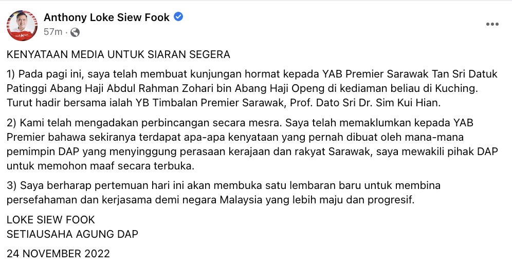 为了成就团结政府的组成,希盟行动党秘书长陆兆福,今日亲自飞到砂拉越礼貌拜会砂盟(GPS)主席阿邦佐哈里,并发文告,就任何行动党领袖过去曾发出冒犯砂拉越政府和人民的言论,代表行动党公开道歉!