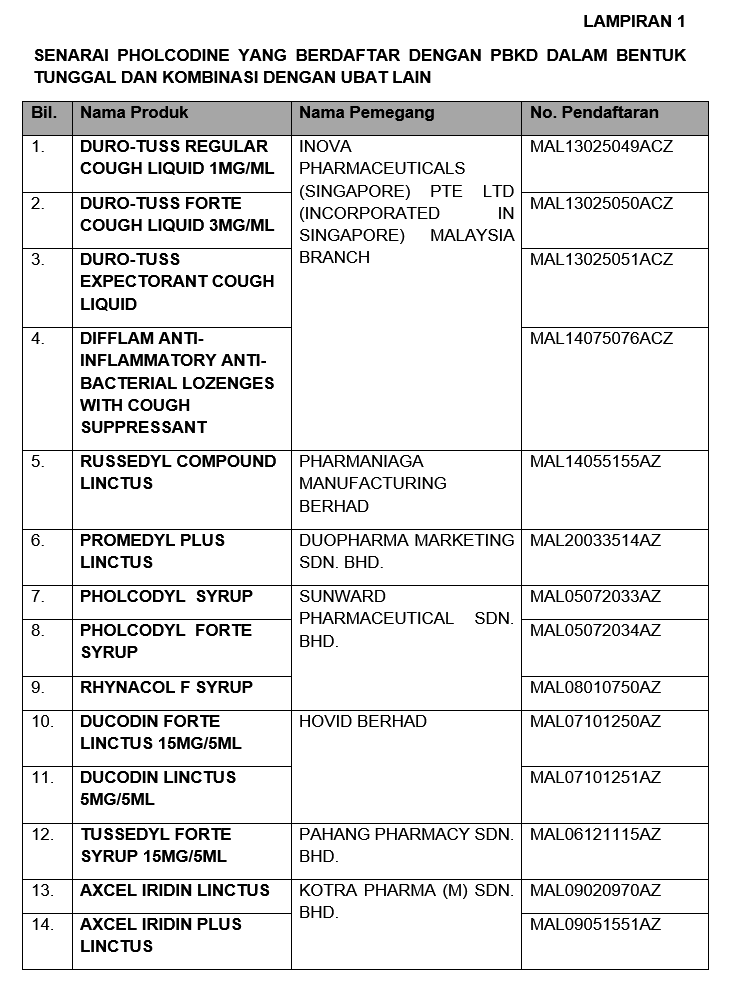 卫生总监诺希山发文告指出,卫生部药品控制执法组在本月20日同意,取消含福尔可定药物的注册,并召回所有含福尔可定成分的产品。