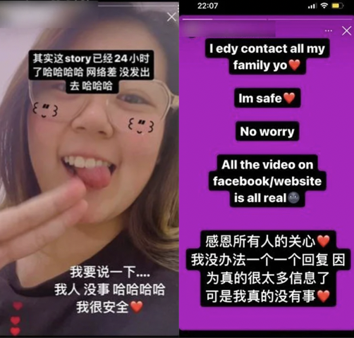 另2则则是于晚上10时许发布,其中一则是文字,内容指自己平安无事且已联系家人;另一则是一张洗脸照片,并注明“洗脸或化妆服务,可安排同事联系”。