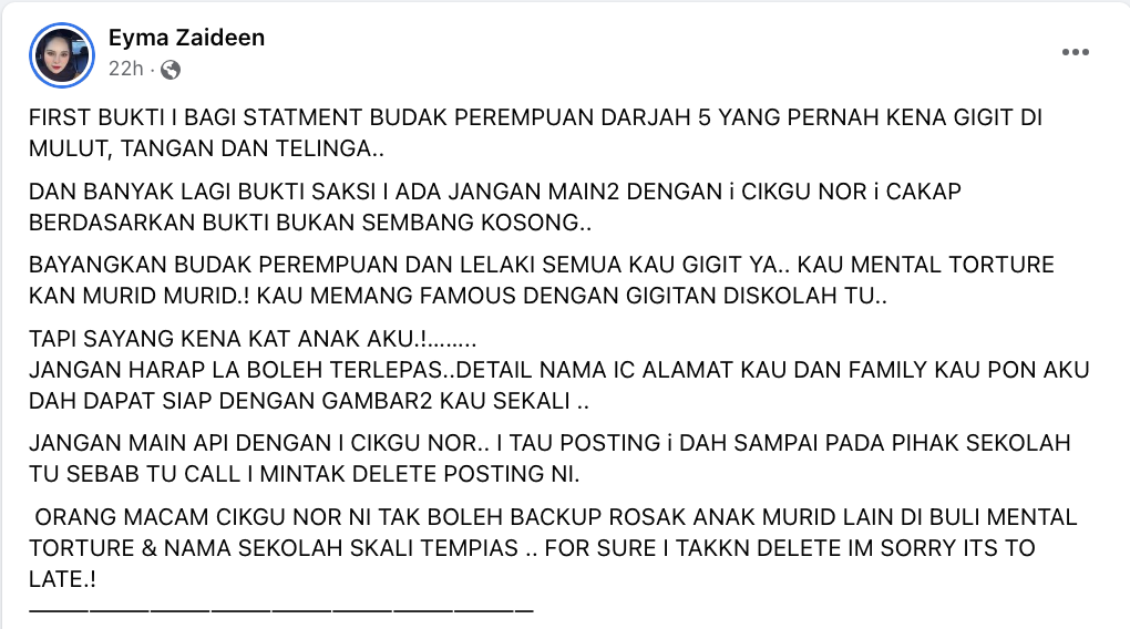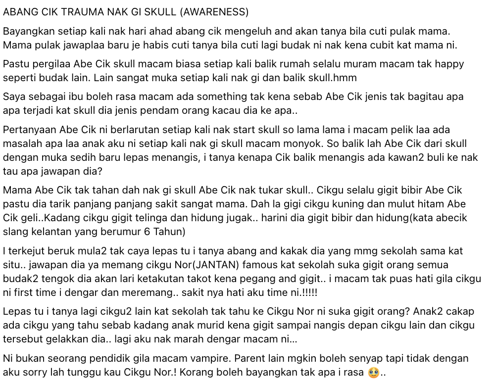这桩事件发生在吉兰丹,这名男童的母亲艾玛(Eyma Zaideen)在自己脸书上撰文指控孩子被一名男老师狂咬。她表示向来个性开朗的儿子近来性情大变,变得不喜欢上学,孩子每到上学天,就会问:“妈妈,学校几时开始放假?”