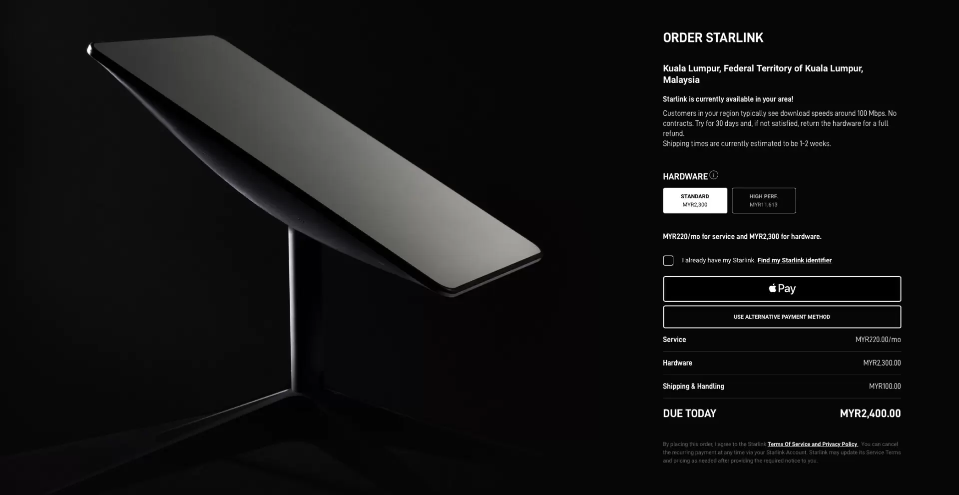大马星链Starlink官网今日宣布即起开始,开放让用户订购卫星宽频服务,每月220令吉的卫星宽频配套,提供100Mbps下载网速,无需签约,但必须另外购买配件。