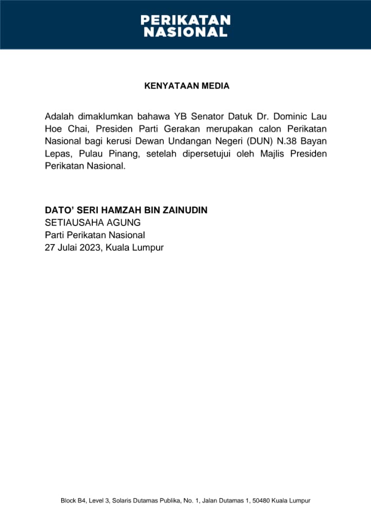 国盟总秘书韩沙再努丁正式官宣,民政党主席刘华才将代表国盟,出战槟州峇六拜州议席。