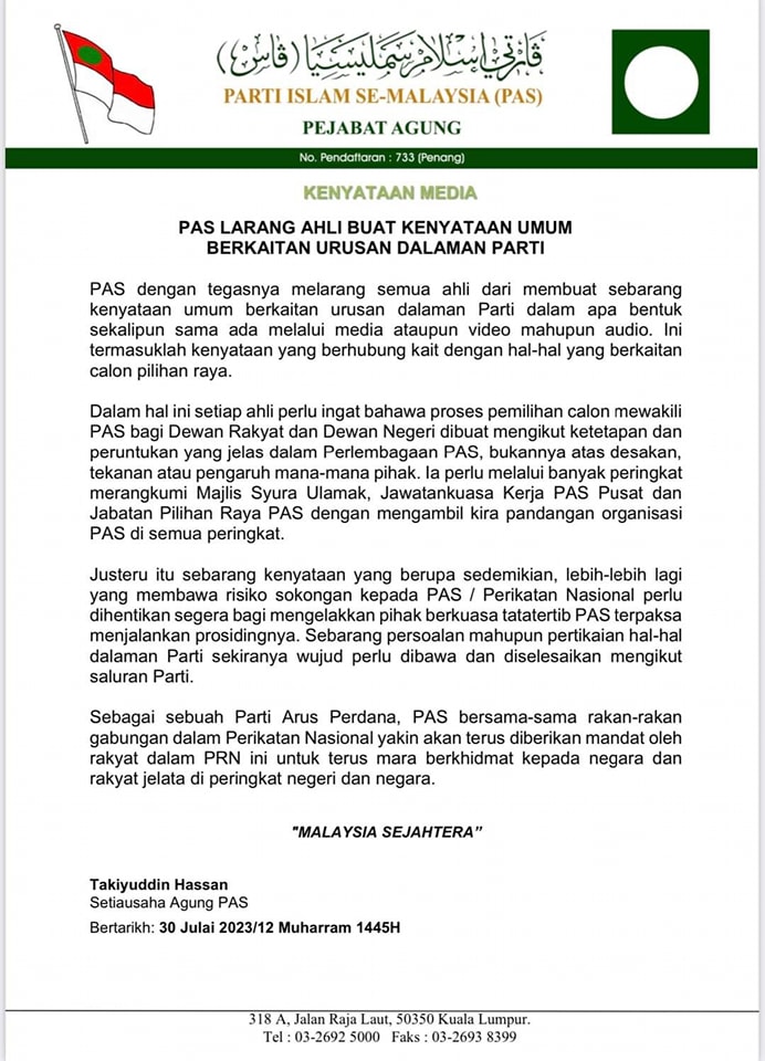 伊党总秘书达基尤丁发表文告,伊党禁止所有党员,透过任何形式,包括社媒、影片或语音,发布公开声明谈论党内事务,包括州选候选人事宜。