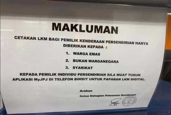 当局宣布,即日起停止发出实体路税纸给私家车和摩哆车主,如今开始在各分局张贴最新告示,指私家车和摩托在更新路税后,不会获得实体版路税纸,而是 必须通过“MyJPJ”应用程式查询更新进展,一旦更新成功,即可获得电子版的路税。