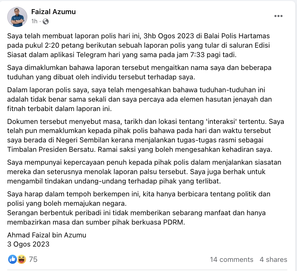 对此,阿末费沙在下午3时脸书发文,他个人就上述在Telegram流传的报案书,在下午2时20分也到金地花园警局备案。