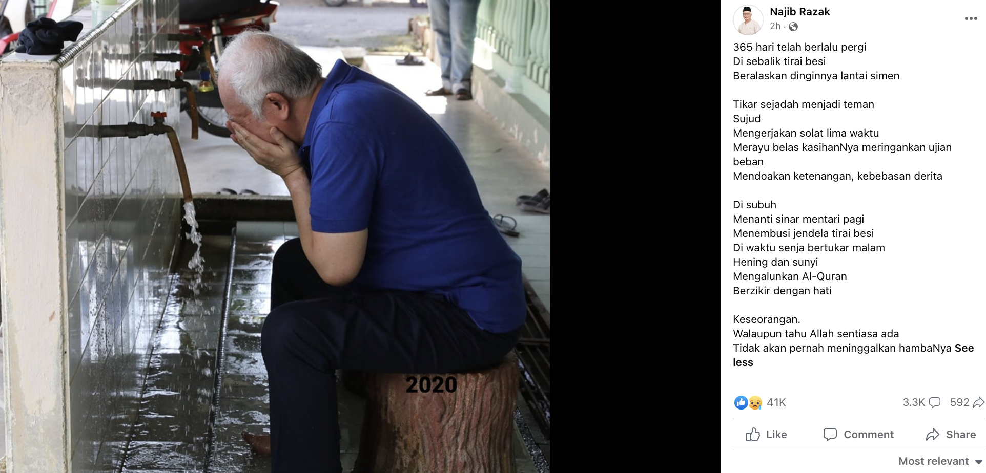 此外,纳吉专页今早也上载另一个另一个贴文,一首马来诗+纳吉在祈祷梳洗净身的照片。