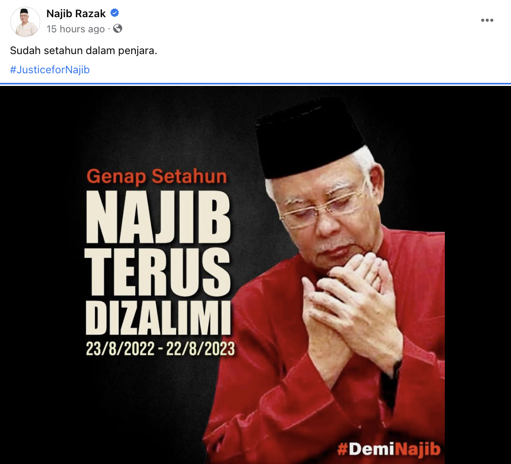 《星洲日报》报道,纳吉脸书昨天上传一张纳吉祈祷的照片,图中配文道:“整整一年,纳吉仍受迫害”,并附上纳吉入狱时间,即2022年8月23日至2023年8月22日。