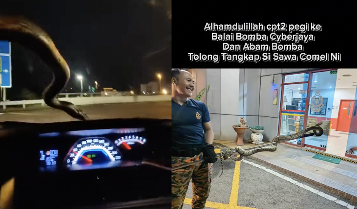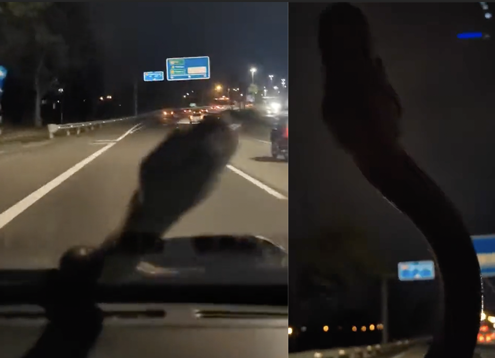 网红“Cikgu Anep”在社媒X发布一段时长2分48秒视频,视频中显示车主和家人开车回家途中,突然有条蟒蛇,从车子的引擎盖处爬出,车主和家人心慌,但还是镇定的把车子开到赛城消拯局求救。