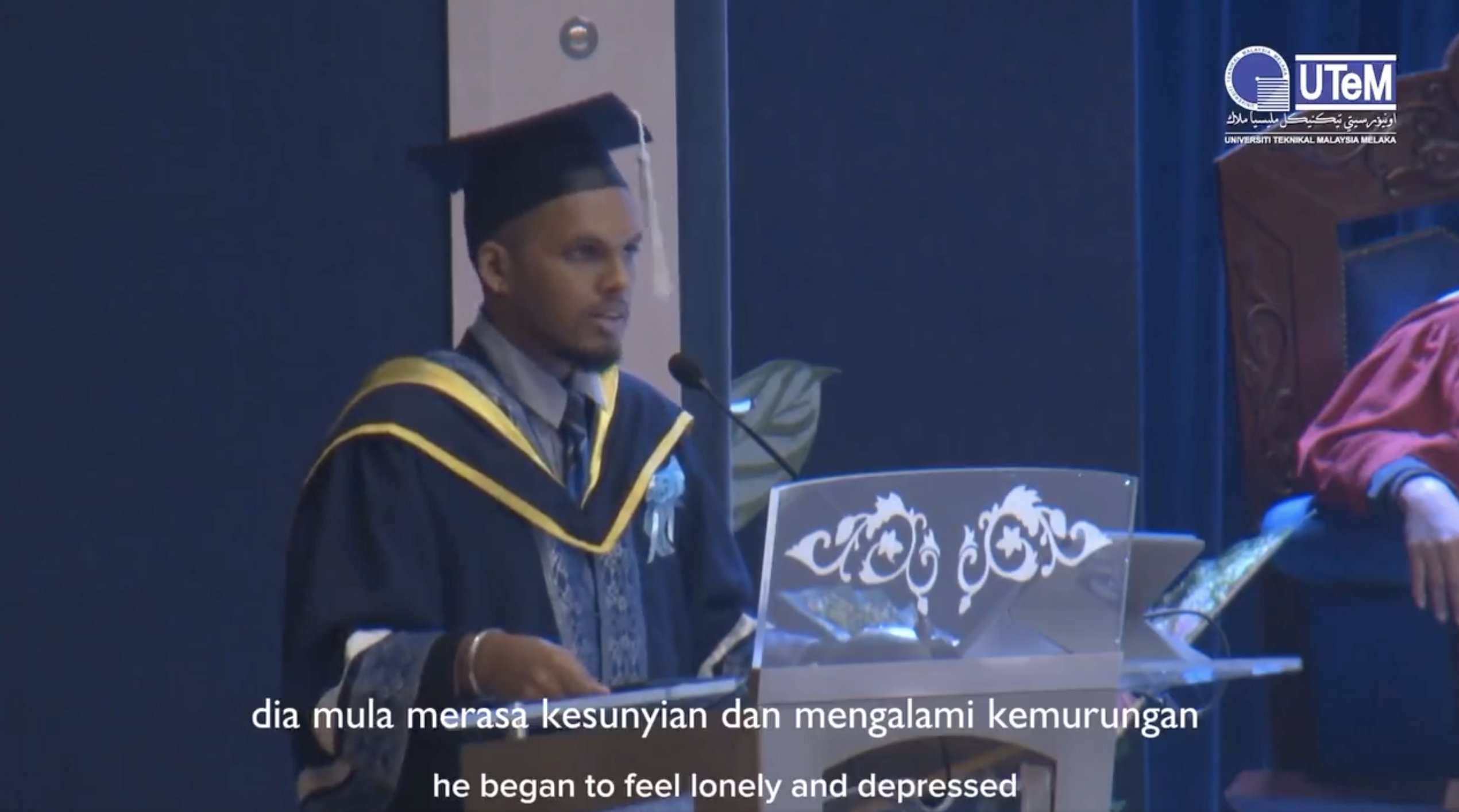 来自马六甲马来西亚技术大学(UTeM)的纳温,在获得皇家学术奖得主后发表得奖感言时,向在场来宾讲述发生在他好友身上的真实案例。