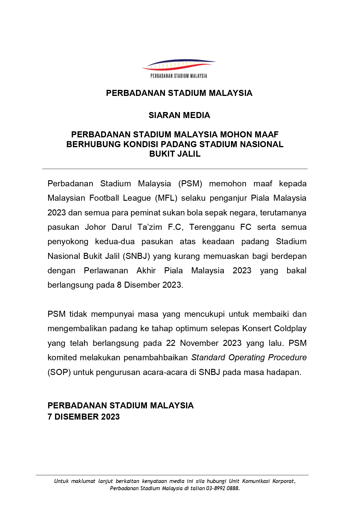 大马体育场管理机构就国家体育场草皮质量,发文向2023年马杯足球赛决赛主办方大马足球联赛(MFL)及所有球迷,特别是两支决赛队伍——柔佛达鲁达格敬和登嘉楼及两支球队支持者道歉。