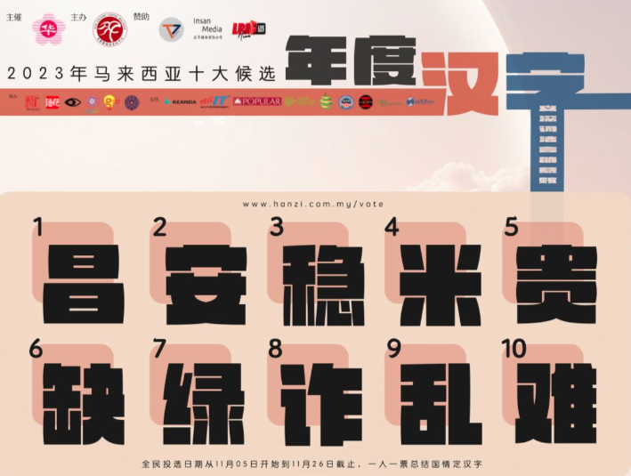 马来西亚2023年度汉字已公布,在10大候选汉字中,今年的大马年度汉字“贵”字位居榜首。