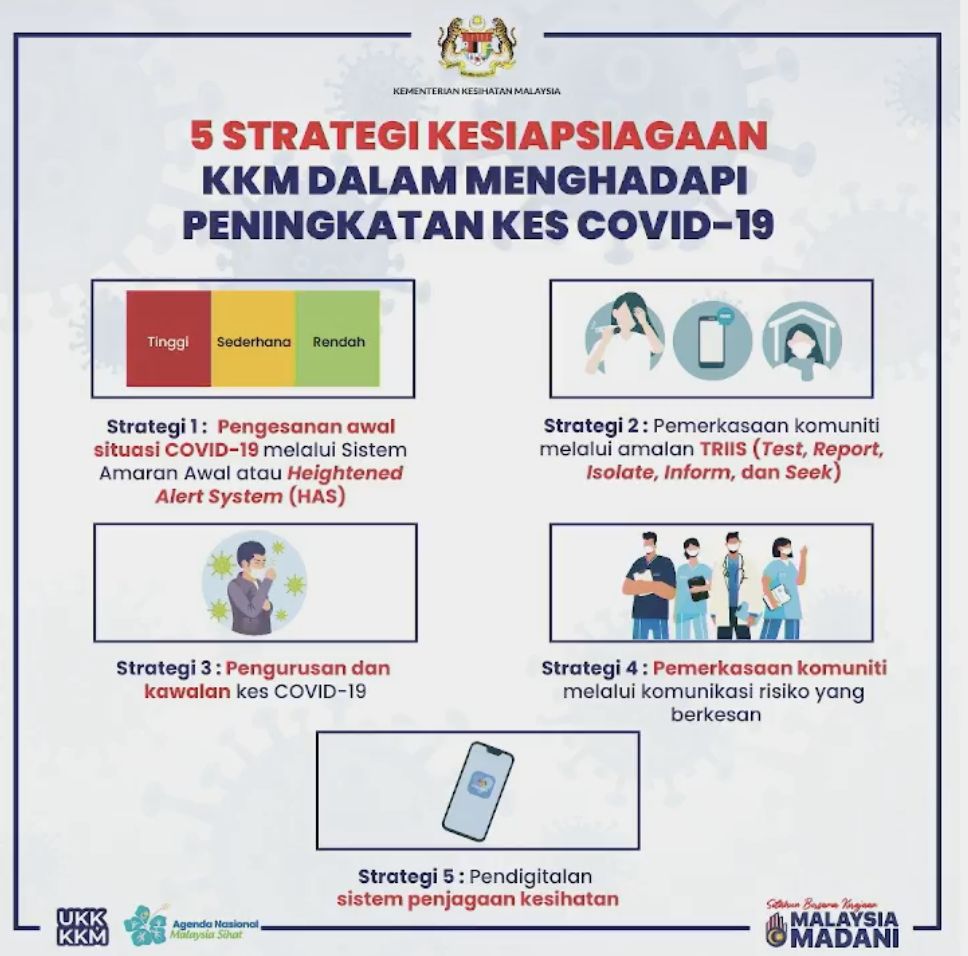 他说,为了应对疫情,卫生部重启5项防疫策略,相关策略包括TRIIS措施,以及通过HAS(Heightened Alert System)预警系统全方位追踪疫情。