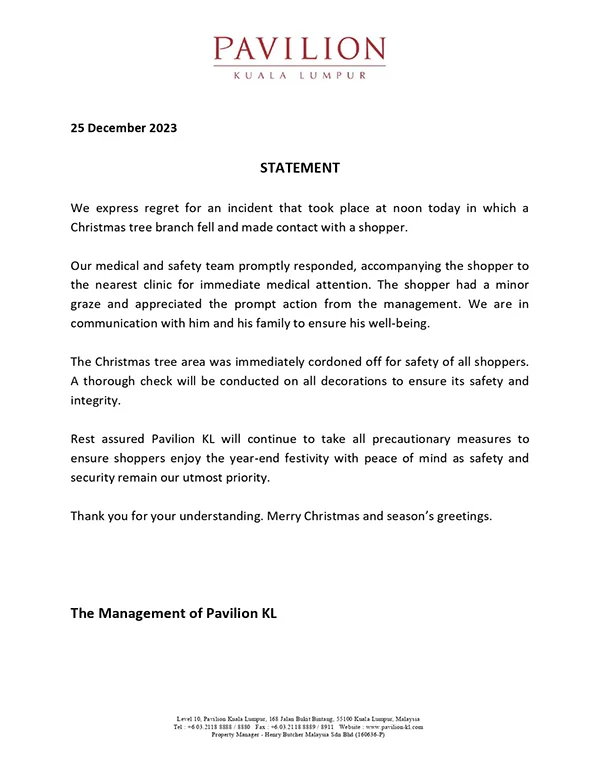 新加坡一名男子与家人来马旅游在吉隆坡柏威年购物商场拍照时,遭一棵悬挂空中的圣诞树装饰脱落砸伤头部,事后,柏威年广场发文道歉并封锁相关区域。