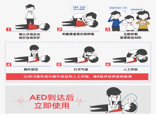 (3)向周围呼救:如患者无回应,自己或让周围人打120,如有自动体外除颤仪(AED),则让周围人取来。