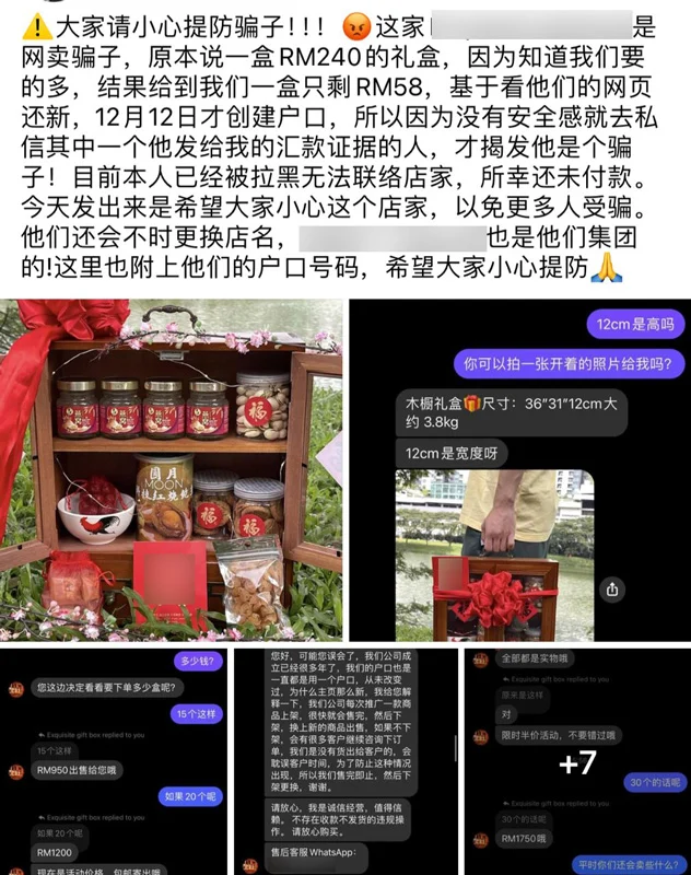 《中国报》报道,诈骗集团趁机在社交网站“发新年财”,他们会以优惠价格“售卖”各种年货,包括肉干、礼篮、年饼、盆菜、冷冻海鲜等,吸引不少民众下单,在请君入瓮后就直接拉黑,让不少网民中招。