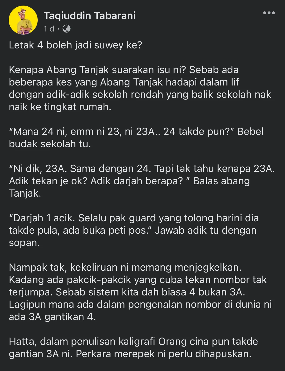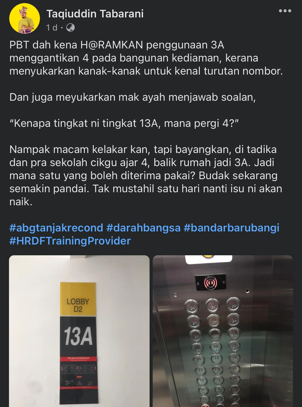 《东方日报》报道,讲师达基尤丁逹巴拉尼在脸书撰文问:“在4楼放‘4’这个号码真的会衰吗?”