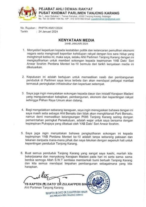 “我了解到政治稳定和经济复苏的重要性,也醒悟到人民因生活成本上升而承受的痛苦,所以,我宣布即起支持安华领导的政府。”