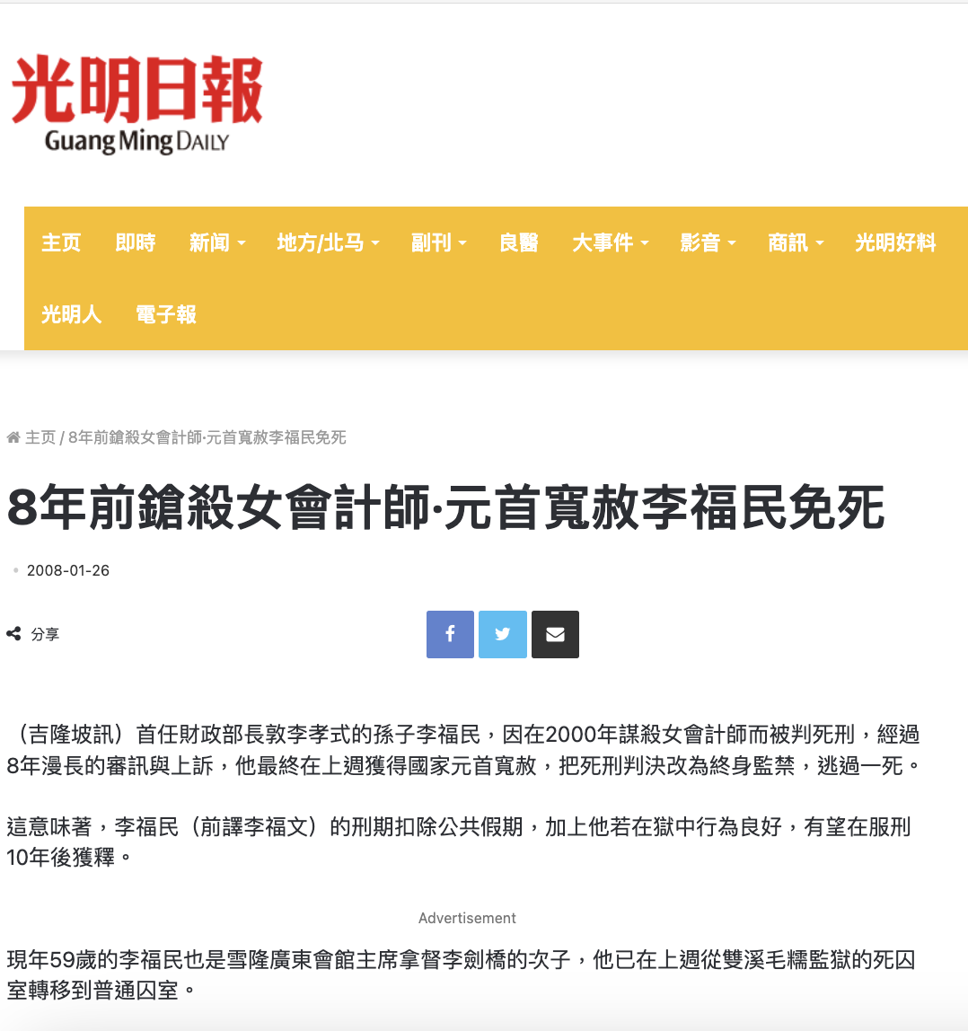 再来一个,就我国第一任财政部长敦李孝式的孙子李福民,因为在2000年谋杀 女会计师被判死刑,经过8年漫长审讯与上诉,2018年,他最终获得国家元首 宽赦,把死刑判决改为终身监禁。