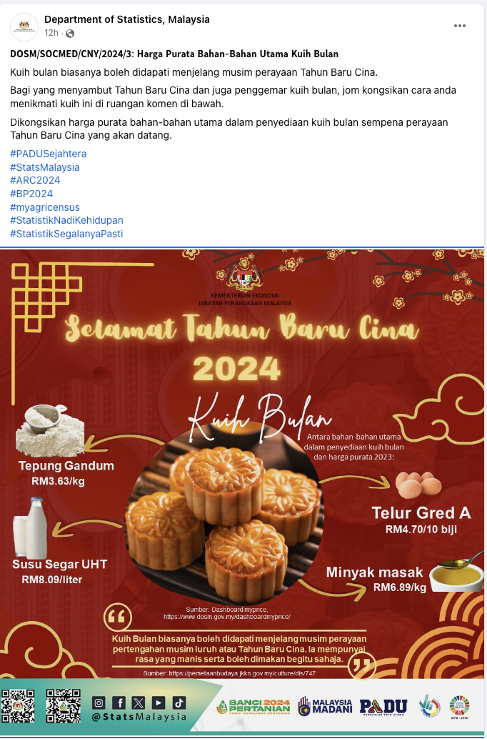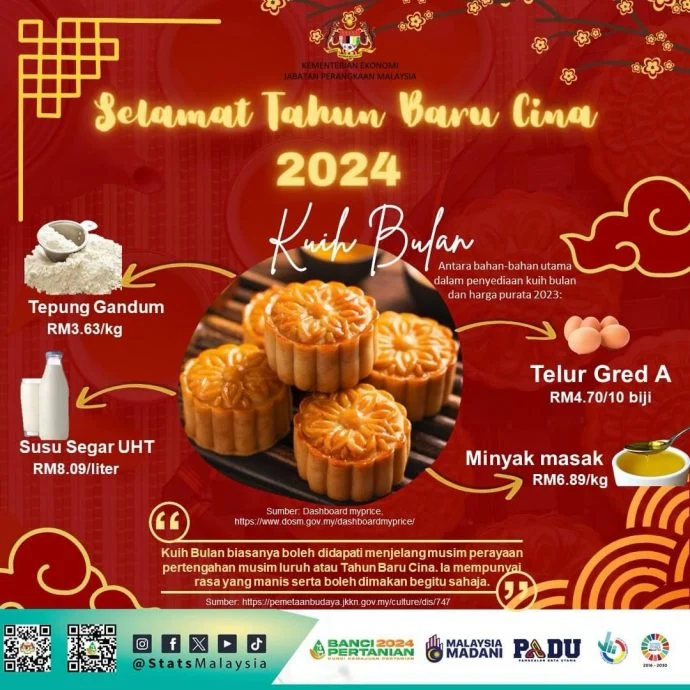 统计局(DOSM)在贴文中说:“致所有庆祝华人新年,及喜欢吃月饼的你,可在留言区分享各自吃月饼的方式”,月饼图还上月饼原料的平均价格,让网民可以知道各原料如面粉、鸡蛋、食油与牛奶的平均售价。