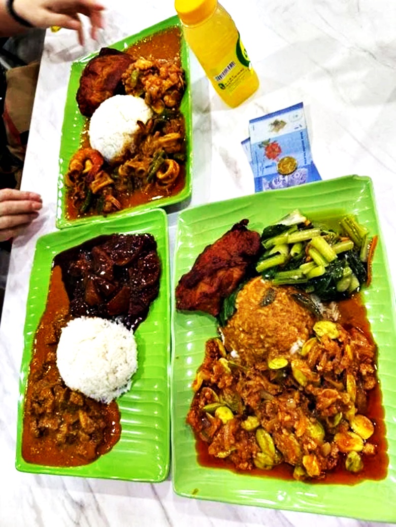 其中一份咖喱饭配有炸鸡、蔬菜和海鲜,包括虾和鱿鱼,并盖上浓郁的咖喱酱汁;另一份咖喱饭则配有炸鸡、辣炒蔬菜和用辣椒酱烹煮的臭豆;他们还点了一瓶饮料。