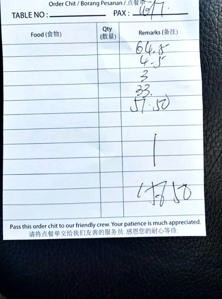 3份咖哩饭共收费156令吉50仙,惟账单上并未清楚标示每盘咖喱饭的具体价格,让消费者难以理解店家的计算方式