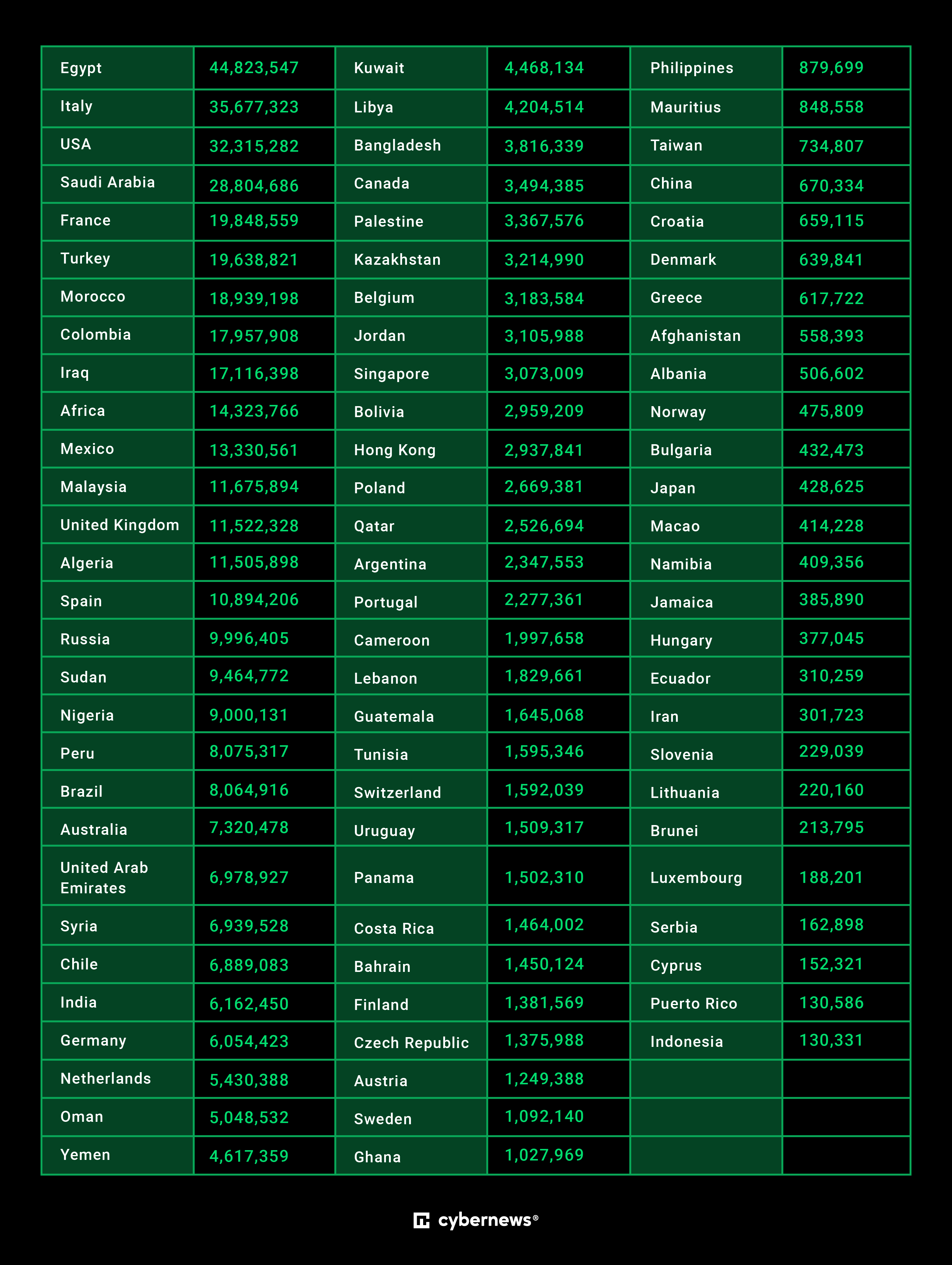 CyberNews发现,本月16日,有骇客组织在骇客论坛兜售超过4.87亿个WhatsApp用户资料,当中最多受影响的国家包括埃及(4482万人)、意大利(3567万人)、美国(3231万人)、沙地阿拉伯(2880万人)等,大马也有约1167万人受影响。