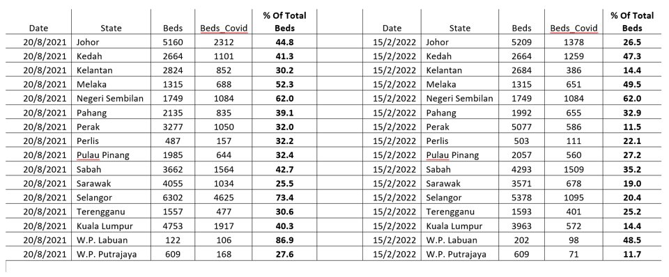 根据阿玛星贴出的数据表,多个州属的冠病病床量(占总病床比例),比起去年减少了一半左右,如柔佛、吉兰丹、霹雳、吉隆坡、纳闽及布城。