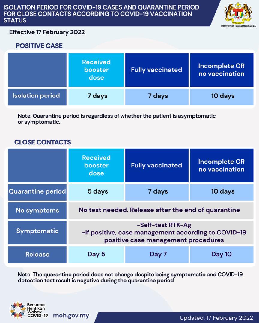 根据卫生部在脸书发布的图表显示,冠病确诊者无论有无症状,已接种加强针者,及完成疫苗接种者的隔离天数皆为7天;至于没完成接种者或没接种疫苗者,则隔离10天。
