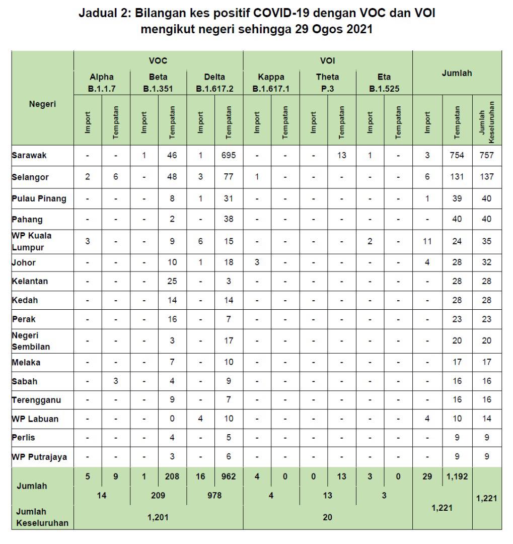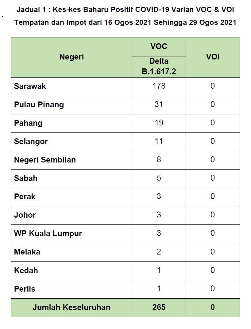 卫生总监丹斯里诺希山指出,在脸书发文指出,在8月16日至8月29日期间,大马医药研究院(IMR)、雪州玛拉工艺大学综合药物基因组学研究所(iPROMISE) 及砂拉越大学卫生及社区医药机构(IHCM)各别检测出39宗、48宗以及178宗Delta变异毒株病例。