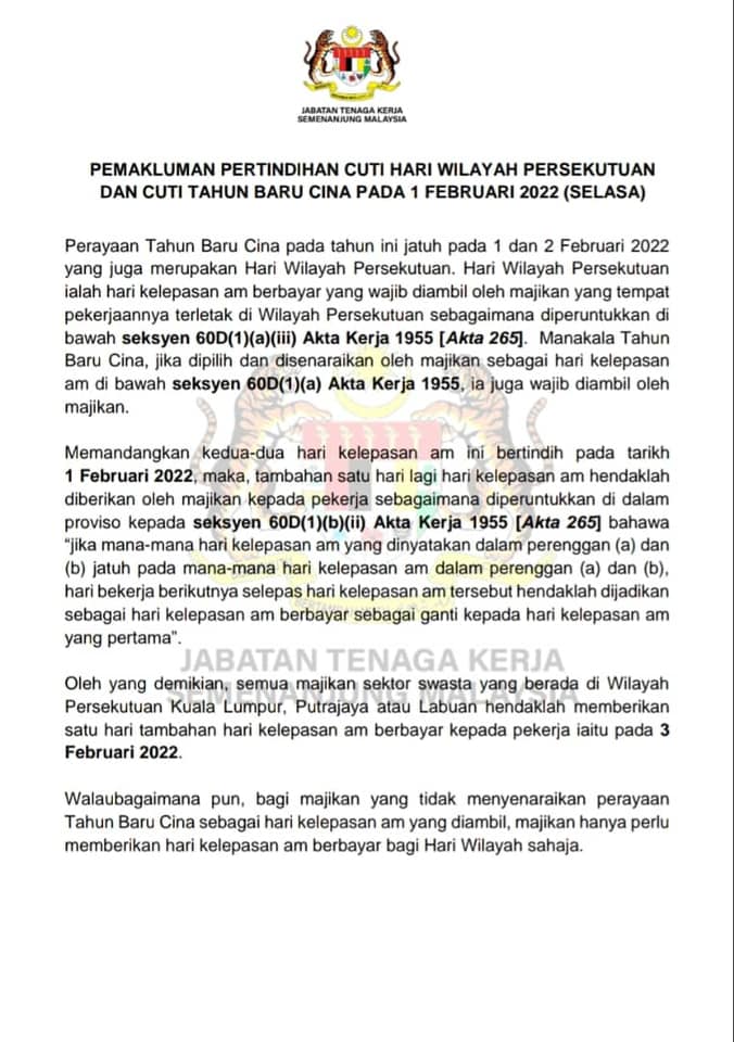 由于21日农历新年与联邦直辖区日重叠,吉隆坡、布城和纳闽的私人界的雇主必须在 23日为员工额外提供一天的有薪公共假期。