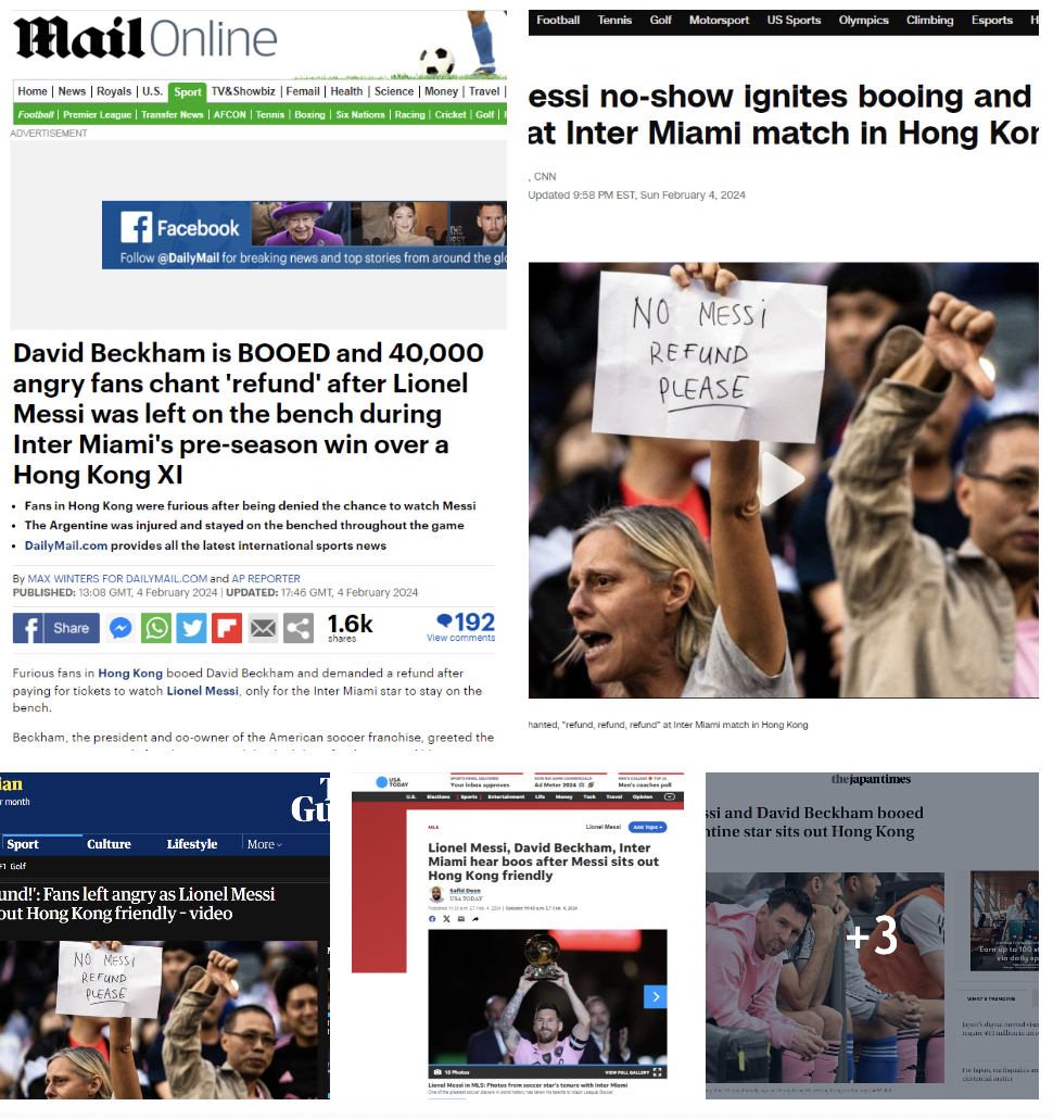 梅西访香港全场坐后备席如布景板,引发全场嘘爆要退款,新闻热度的发酵让国际主流大媒体纷纷报道,英国《每日邮报》(Daily Mail)、《卫报》(The Guardian)、英国广播公司(BBC)、美国有线新闻网络(CNN)、美国广播公司(ABC)、美国今日报(USA Today)及《日本时报》(The Japan Times)等外国传媒全部篇幅报道,以致有网民戏称:“香港果然又回到国际舞台!”